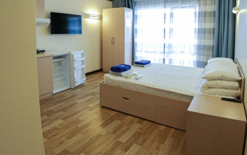 В номере: кровати односпальные /одна двуспальная кровать, кухонная мебель, прикроватные тумбочки, стол, стулья, мини-кухня, кондиционер, мини-холодильник, набор посуды, плита электрическая, телевизор, электрочайник