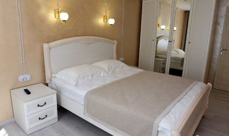 В номере: стол, 2 стула, кресло, журнальный столик, шкаф, гладильная доска, кондиционер, микроволновая печь, посуда, телевизор, утюг, фен, холодильник, электрочайник, мягкая мебель, спальный гарнитур с двуспальной кроватью, кухня. Либо: журнальный столик, шкаф-купе, гладильная доска, кондиционер, микроволновая печь, посуда, телевизор, утюг, фен, холодильник, электрочайник, мягкая мебель, спальный гарнитур с двуспальной кроватью.