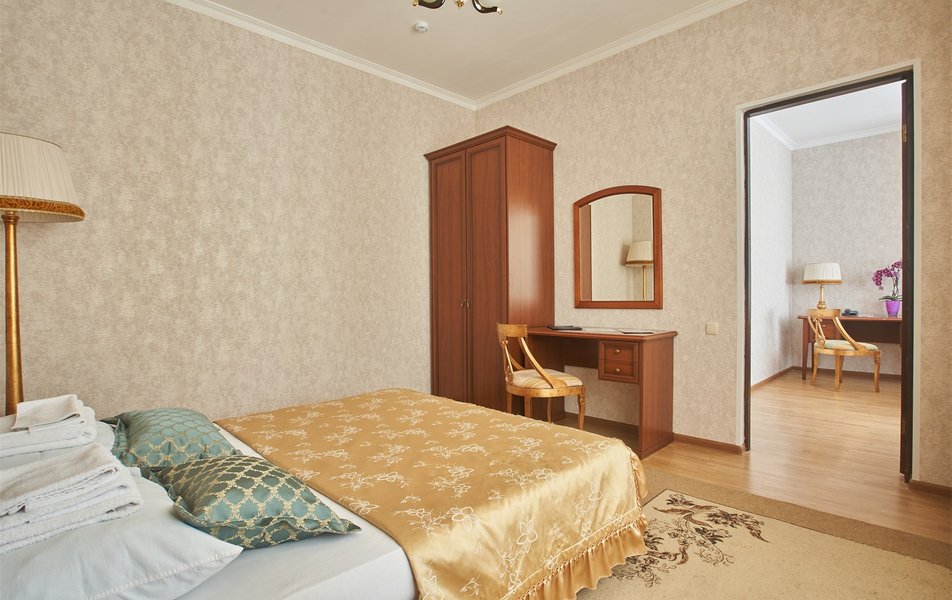 В номере: вешалка, зеркало, кресло, диван, кровати односпальные /одна двуспальная кровать, прикроватные тумбочки, стол, столик журнальный, шкаф, телевизор, телефон, холодильник, чайный набор посуды, электрочайник