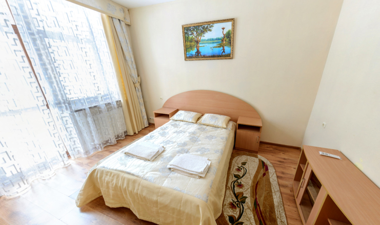 В номере: вешалка, диван, зеркало, кровать двуспальная, прикроватные тумбочки, стол, стулья, шкаф-купе, набор посуды, телевизор, холодильник